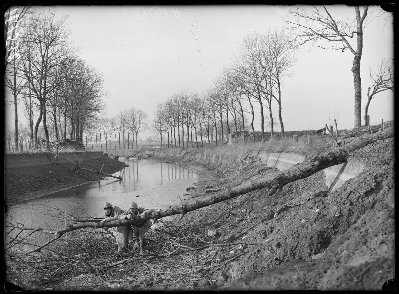 Défenses de l'étang de Parroy. Guetteur dans le lit du canal vidé par les allemands. [légende d'origine]