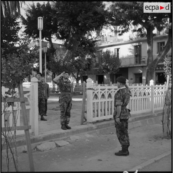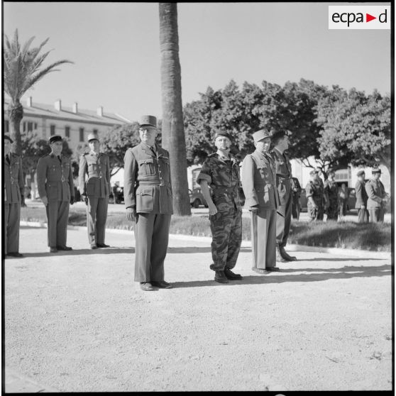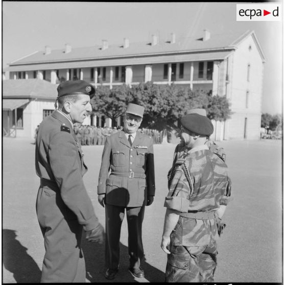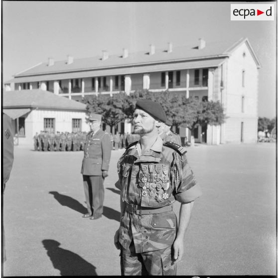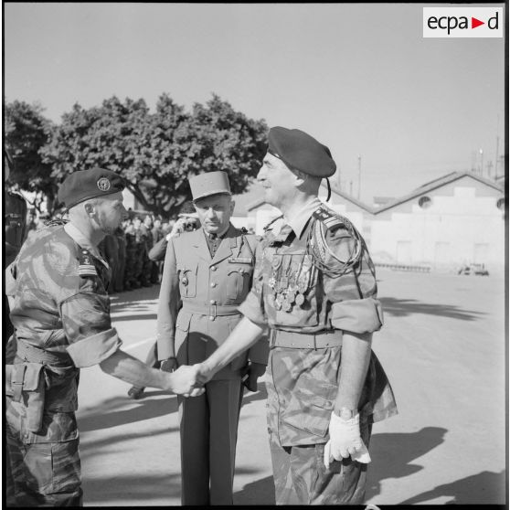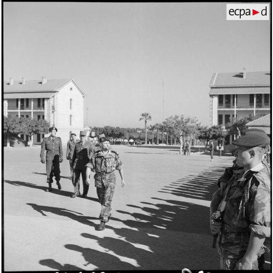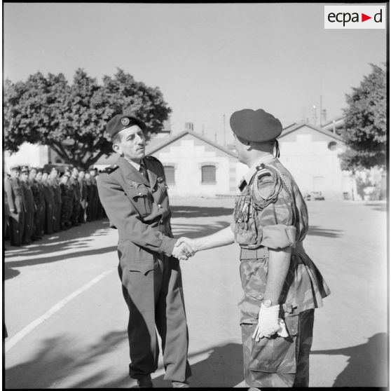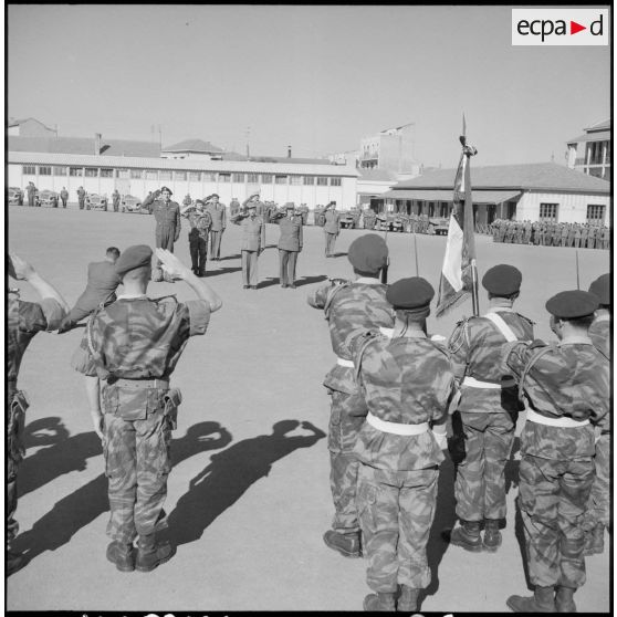 Le colonel Château-Jobert saluant, lors d'une prise d'armes du 2e régiment de parachutistes coloniaux (RPC) à Koléa.