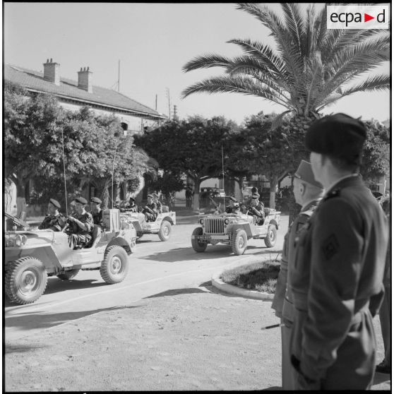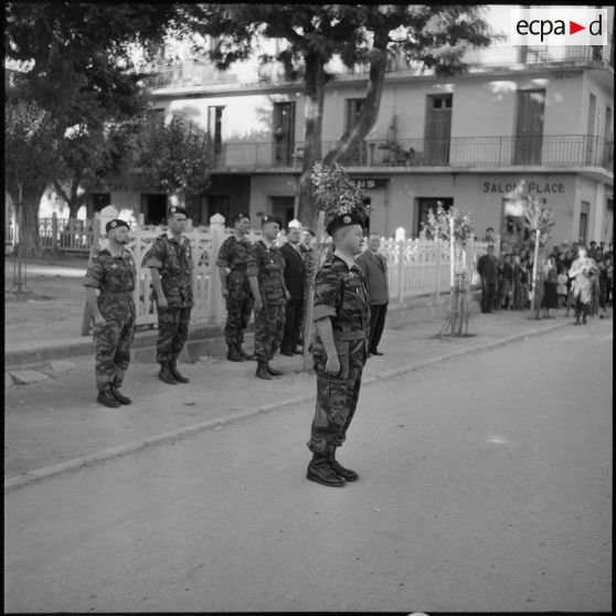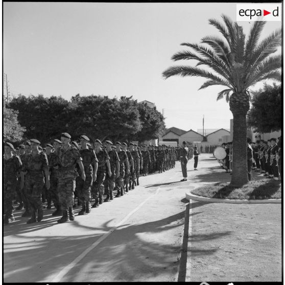 Défilé à pied du 2e régiment de parachutistes coloniaux (RPC) dans une rue de Koléa.