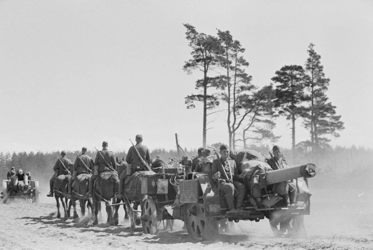 Devant le général (Generalleutnant) Theodor Scherer, commandant la 83e division d'infanterie allemande, une batterie de canons de 15 cm FH 18 tractés du 183e régiment d'artillerie.