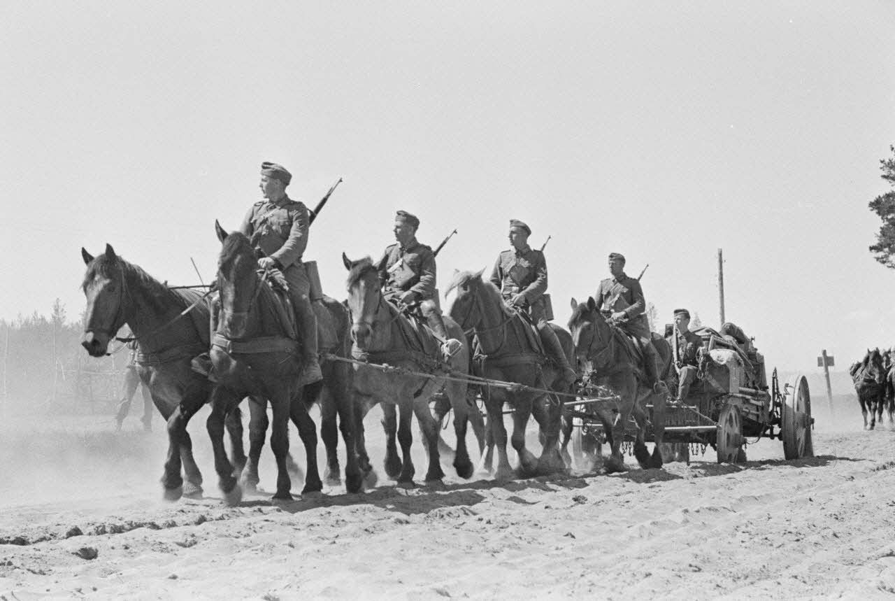 Une charrette hippomobile dotée de deux mitrailleuses MG-34 jumelées Maschinengewehrwagen 36 (If. 5), lors d'un défilé rythmé par le corps de musique du 83e régiment d'artillerie (évoluant au sein de la 83e division d'infanterie).