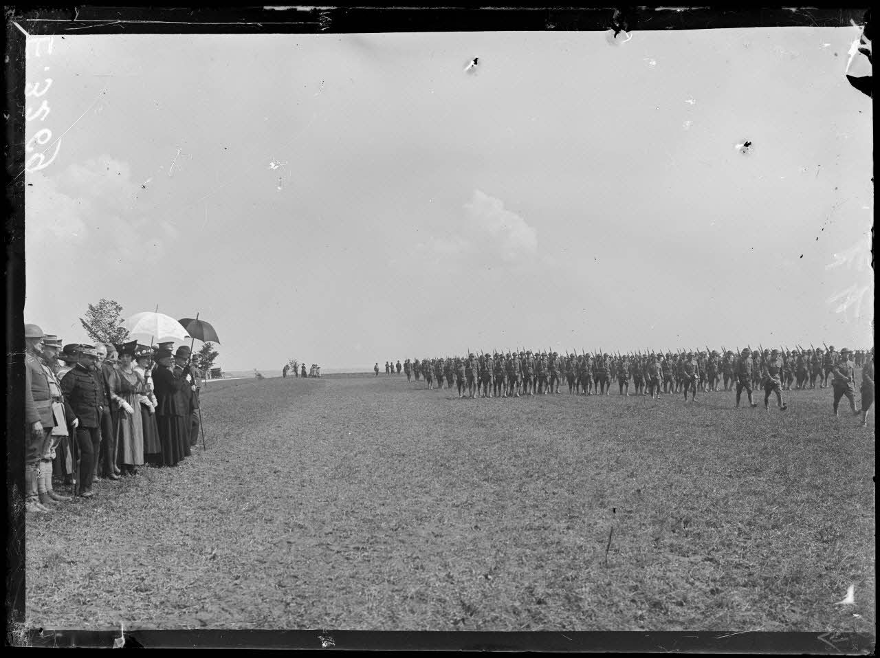 Défilé de troupes sous le regard d'autorités civiles et militaires.