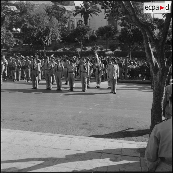 Le général Gouraud, commandant la 27e division d'infanterie alpine stationnée à Tizi-Ouzou participe à cette cérémonie militaire. Il est photographié passant les troupes en revue (R12, R15 à R17, R19, R20), remettant des décorations (R9), au garde à vous parmi ses hommes (R1), saluant le drapeau du 13e régiment de dragons parachutistes (R2, R4).