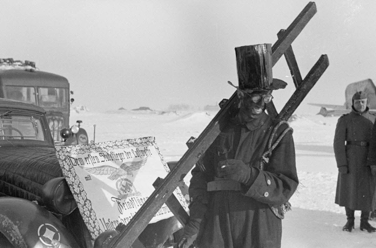 Déguisé en ramoneur, un membre du Sturzkampfgeschwader 2 Immelmann accompagne une affiche qui va accueillir le pilote Rudel.