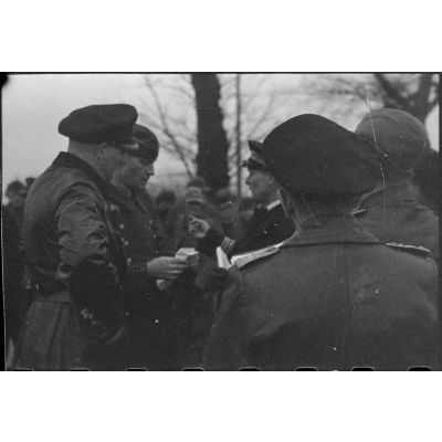 Délégations militaires française et allemande sur le lieu d'échange de prisonniers.
