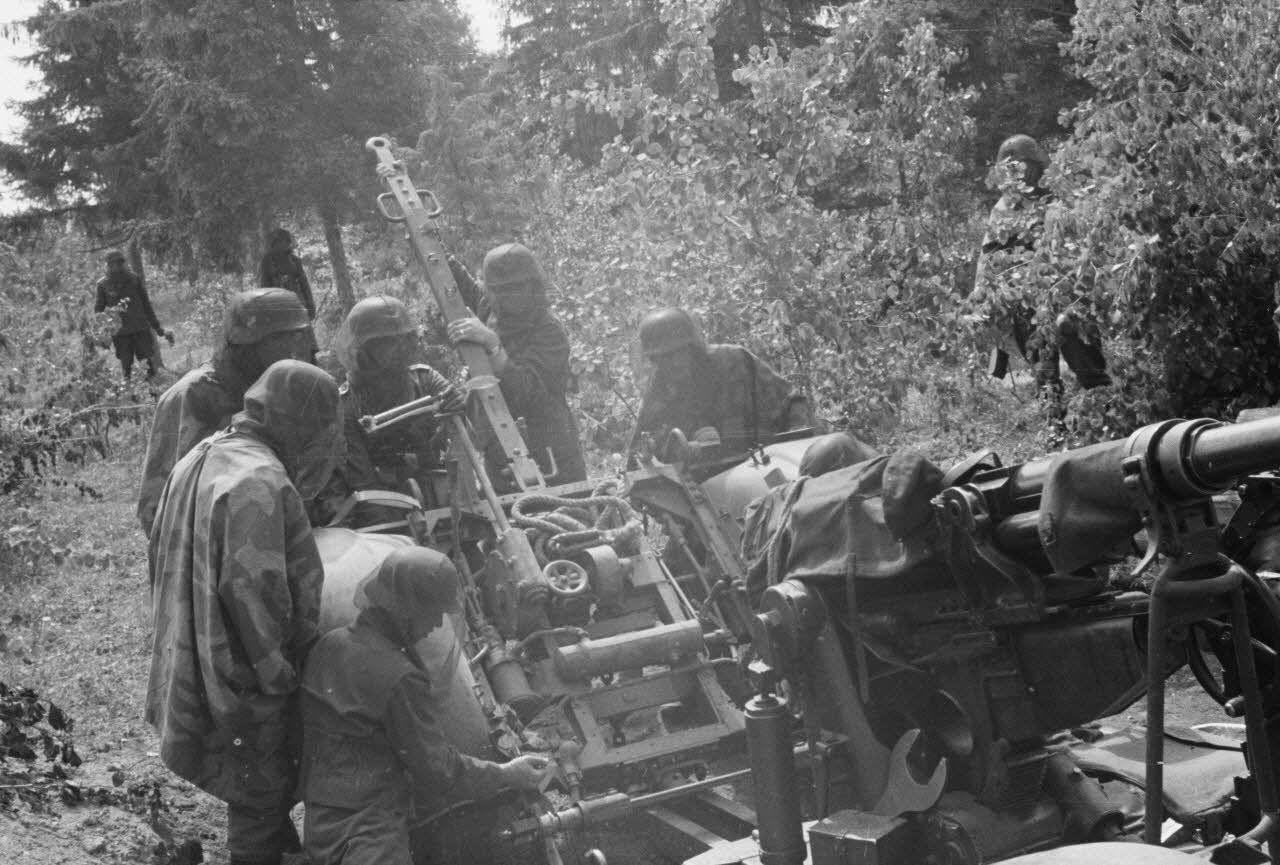 Les servants de cette pièce de 3,7 cm FlaK sont guidés par un télémètre portatif. Un fusil russe capturé Tokarev Svt 40 est comparé au pistolet-mitrailleur allemand MP-40. Dans une tranchée, un reporter de la 1re compagnie de propagande de l'armée de l'air est parmi des fantassins de l'armée de l'air allemande (DAA 2126 L04), on note son appareil photographique Leica. La pièce de DCA est par la suite démontée puis attelée pour le transport.