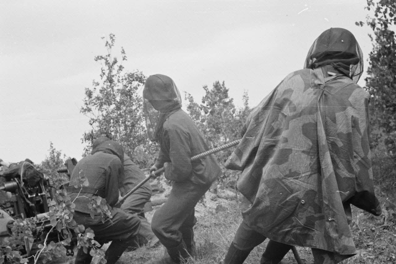 Les servants de cette pièce de 3,7 cm FlaK sont guidés par un télémètre portatif. Un fusil russe capturé Tokarev Svt 40 est comparé au pistolet-mitrailleur allemand MP-40. Dans une tranchée, un reporter de la 1re compagnie de propagande de l'armée de l'air est parmi des fantassins de l'armée de l'air allemande (DAA 2126 L04), on note son appareil photographique Leica. La pièce de DCA est par la suite démontée puis attelée pour le transport.