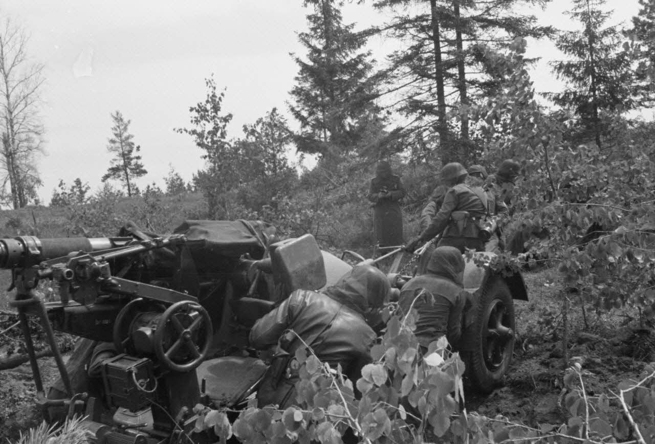 Les servants de cette pièce de 3,7 cm FlaK sont guidés par un télémètre portatif. Un fusil russe capturé Tokarev Svt 40 est comparé au pistolet-mitrailleur allemand MP-40. Dans une tranchée, un reporter de la 1re compagnie de propagande de l'armée de l'air est parmi des fantassins de l'armée de l'air allemande (DAA 2126 L04), on note son appareil photographique Leica. La pièce de DCA est par la suite démontée puis attelée pour le transport.