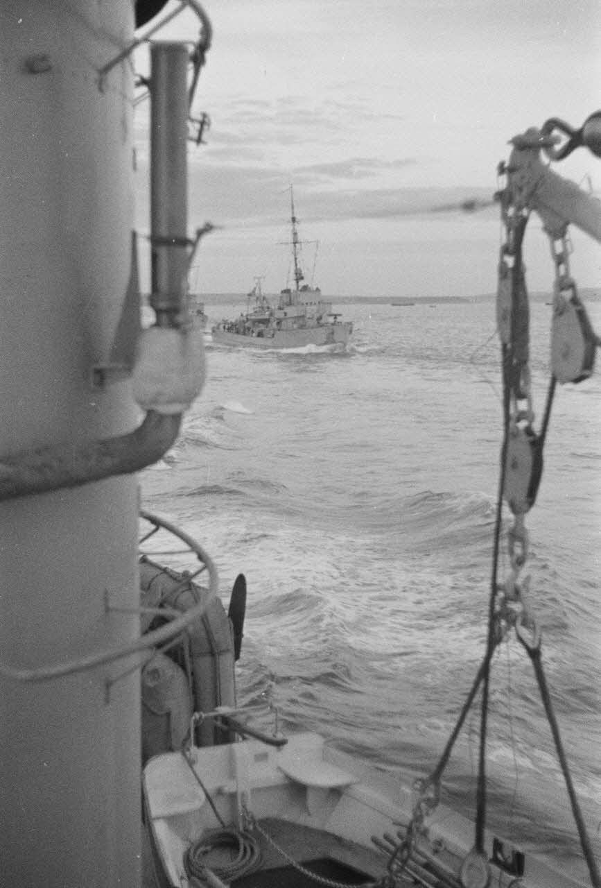 Note : A défaut de légende d'origine, l'ECPAD conserve pour le reporter Kramer un titre d'origine et le numéro de la compagnie dans laquelle évolue le reporter : la 5e demi-compagnie de reporters de guerre de la marine allemande (5 Marine Kriegsberichter-Halbkompanie). Ces informations tapées à la machine et agrafées au début de la pellicule photographique ne mentionnent pas la date ni le lieu du reportage. Le journal de marche de l'unité de propagande (Marine Propaganda-Abteilung West) est disponible aux archives du NARA de Washington (référence : NARA National Microcopy T-77 Roll 1021 Kriegsmarine 269). Pour la période concernée, on trouve la date exacte ainsi que le titre du reportage : 12-24.10 BB Kramer : Bordeinsatz auf einem Minensuchboot.