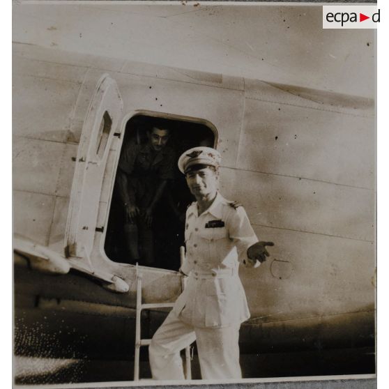 Georges Thierry d'Argenlieu, haut-commissaire de France en Indochine, s'apprête à monter dans l'avion qui va le ramener en France. En guise d'adieu, il fait un signe de la main.