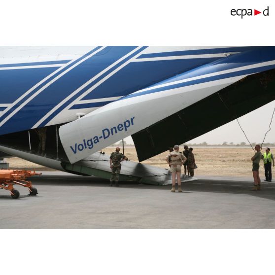 Déploiement de l'opération de la force européenne EUFOR Tchad/RCA (République centrafricaine) : déchargement d'un avion cargo Antonov An-124 de la compagnie aérienne russe Volga-Dnepr en provenance de Douala.