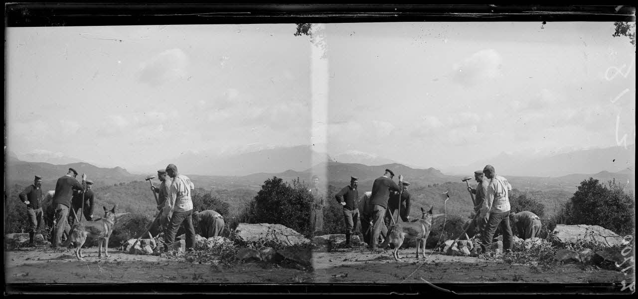 Castelluccio. Dépôt d’officiers allemands. Prisonniers travaillant à la construction d’une route conduisant à la maison des Milelli (maison de Bonaparte).