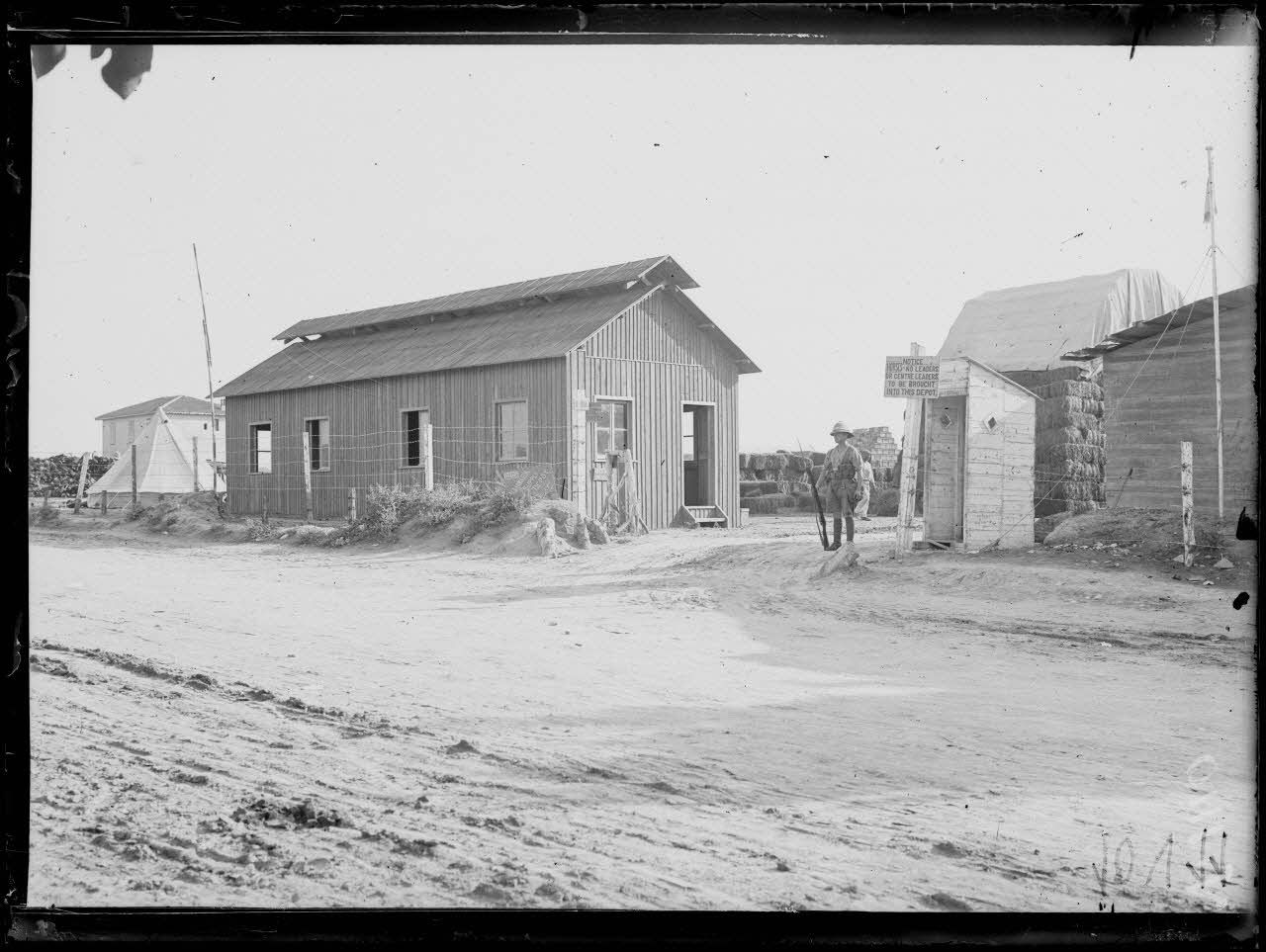 Un dépôt de fourrage dans le camp anglais de Salonique. Une sentinelle anglaise surveille l'entrée.