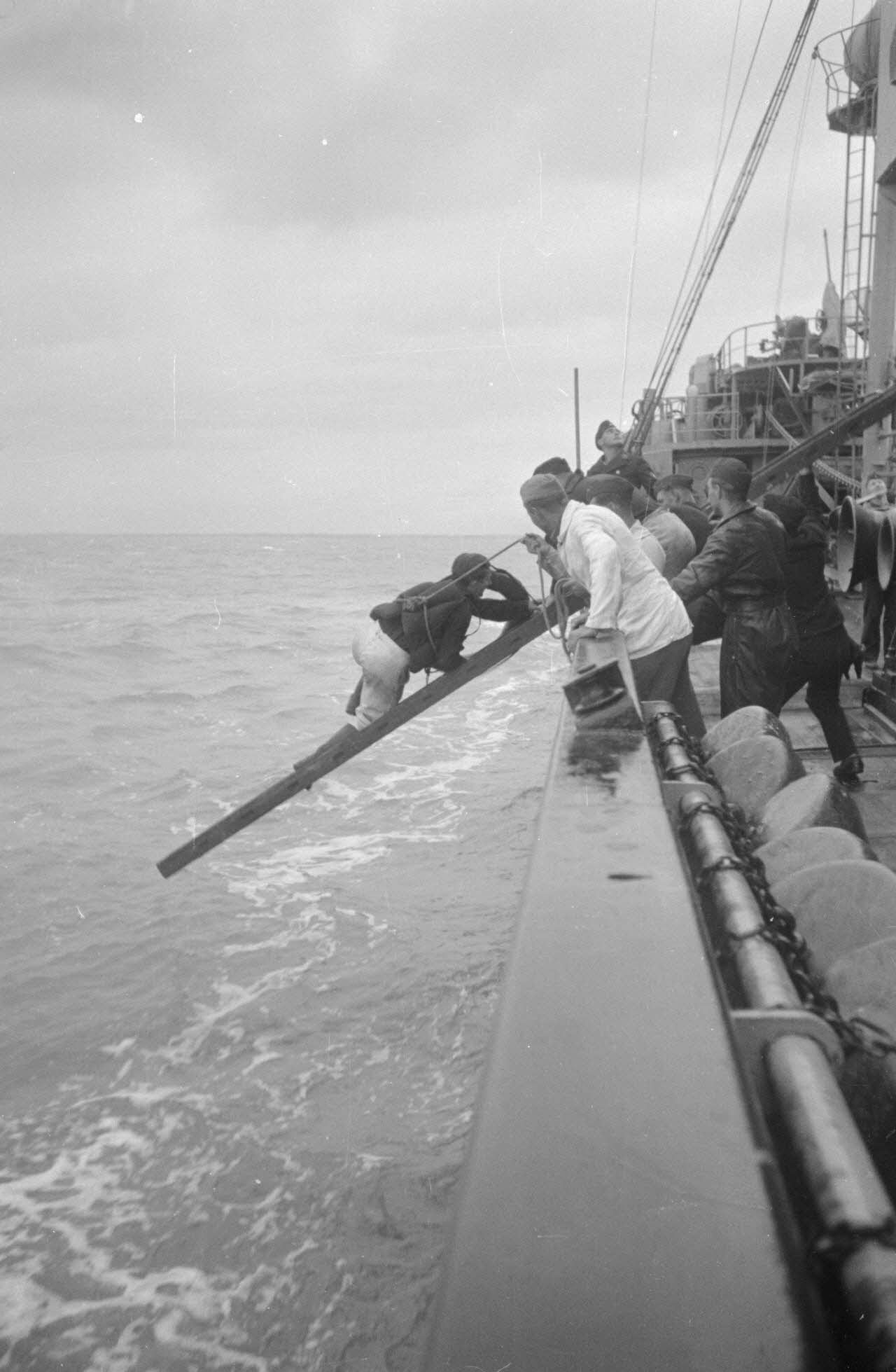 Depuis un dragueur de mines (Minensuchboot), un marin allemand récupère une bouée de sauvetage tombée à la mer.