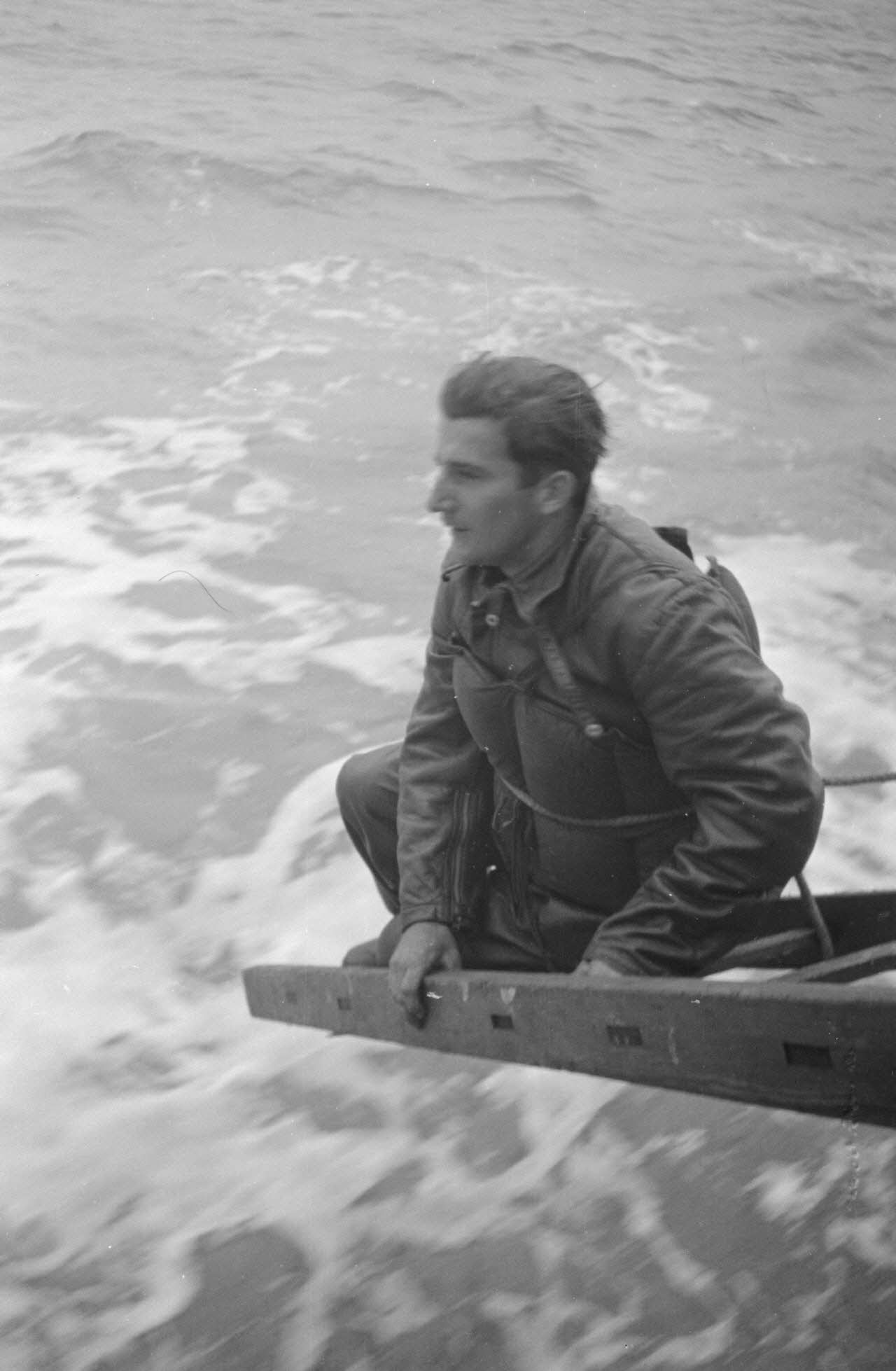 Depuis un dragueur de mines (Minensuchboot), un marin allemand récupère une bouée de sauvetage tombée à la mer.