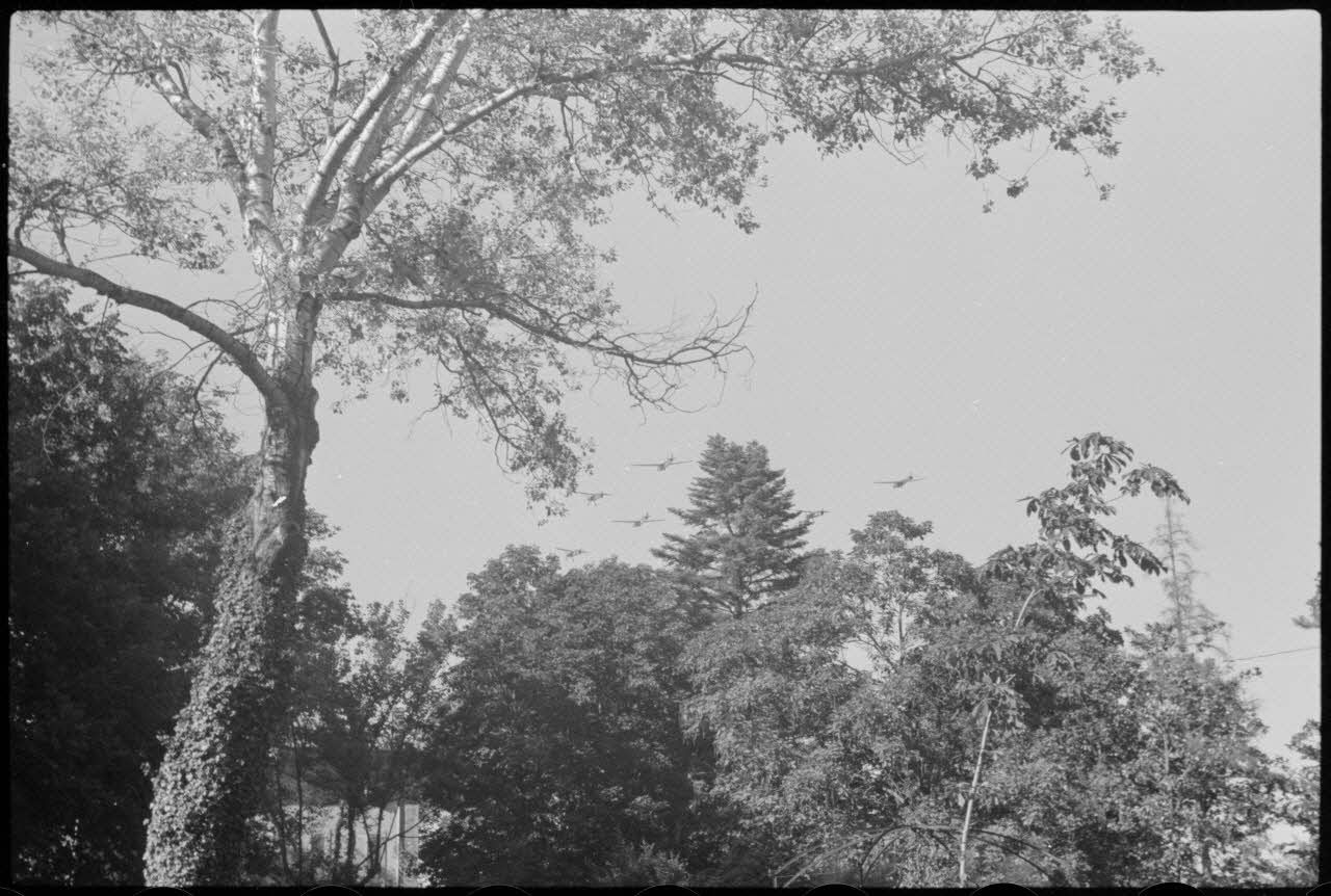 Depuis une maison réquisitionnée où s'est implanté l'état-major du Luftlandegeschwader 1, vue sur un planeur DFS-230 et deux tracteurs Henschel Hs-126 viennent de décoller.