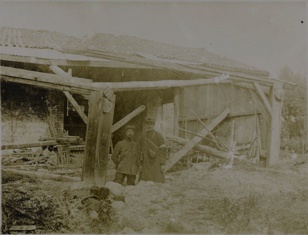 Les archives photographiques du médecin major Augarde (1869-1943), affecté au 138e régiment d''infanterie, sont caractéristiques de la production d''images fixes des militaires pendant la Grande Guerre : portraits de militaires, cantonnements aménagés dans des tranchées et des habitations indviduelles, ruines engendrées par les bombardements ennemis, etc. Les photographies cotées en D0349-004 étaient conditionnées dans une enveloppe intitulée « La Champagne (Saint-Hilaire). 1er séjour ». Aussi, la plupart de ces photographies ont été réalisées dans le secteur de Saint-Hilaire-le-Grand (Marne).