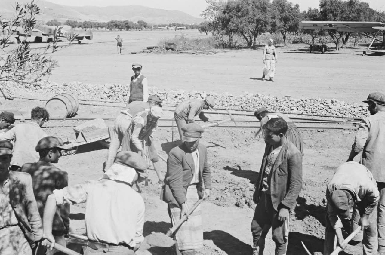 Sur le terrain d'aviation de Kastelli, en Crète, des ouvriers crétois travaillent à l'agrandissement de l'aérodrome.