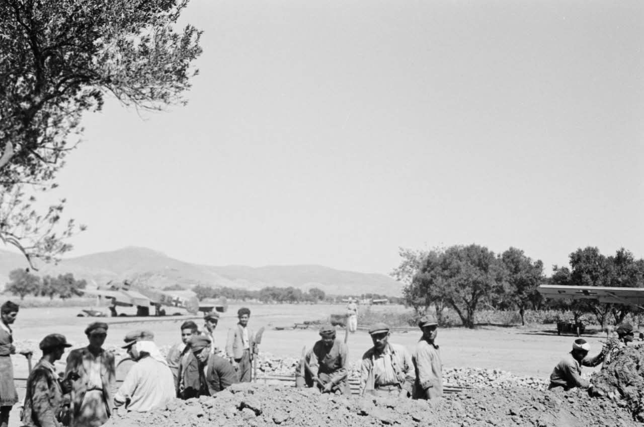 Sur le terrain d'aviation de Kastelli, en Crète, des ouvriers crétois travaillent à l'agrandissement de l'aérodrome.