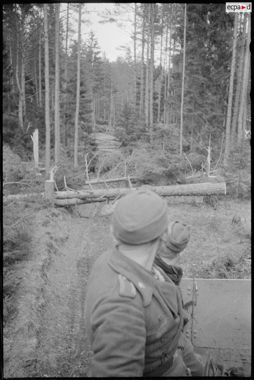 Des arbres ont été volontairement coupés par la résistance pour interdire la progression des véhicules allemandes, ici des Nashorn du Schwere Panzer Abteilung 519.