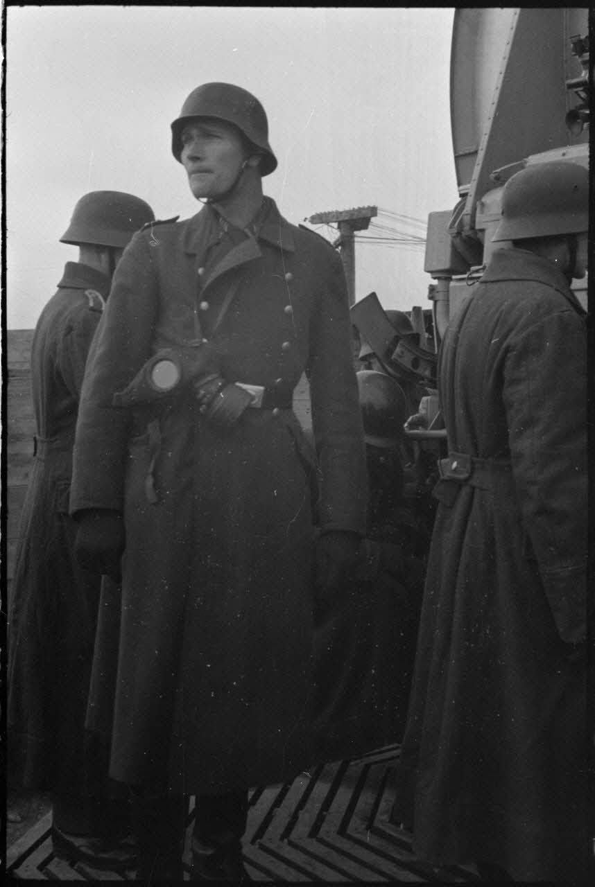 Au sein d'une batterie de 8,8 cm FlaK, les servants d'un télémètre (Kommandogerät 36) apportent leur appui feu à l'aide de fusil Mauser 98k.