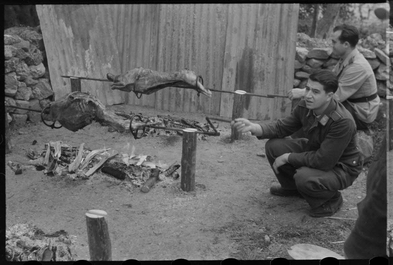 Partage de la viande lors d'un méchoui organisé au sein d'une unité de reconnaissance de l'armée de l'Air allemande (Aufklärungsgruppe).