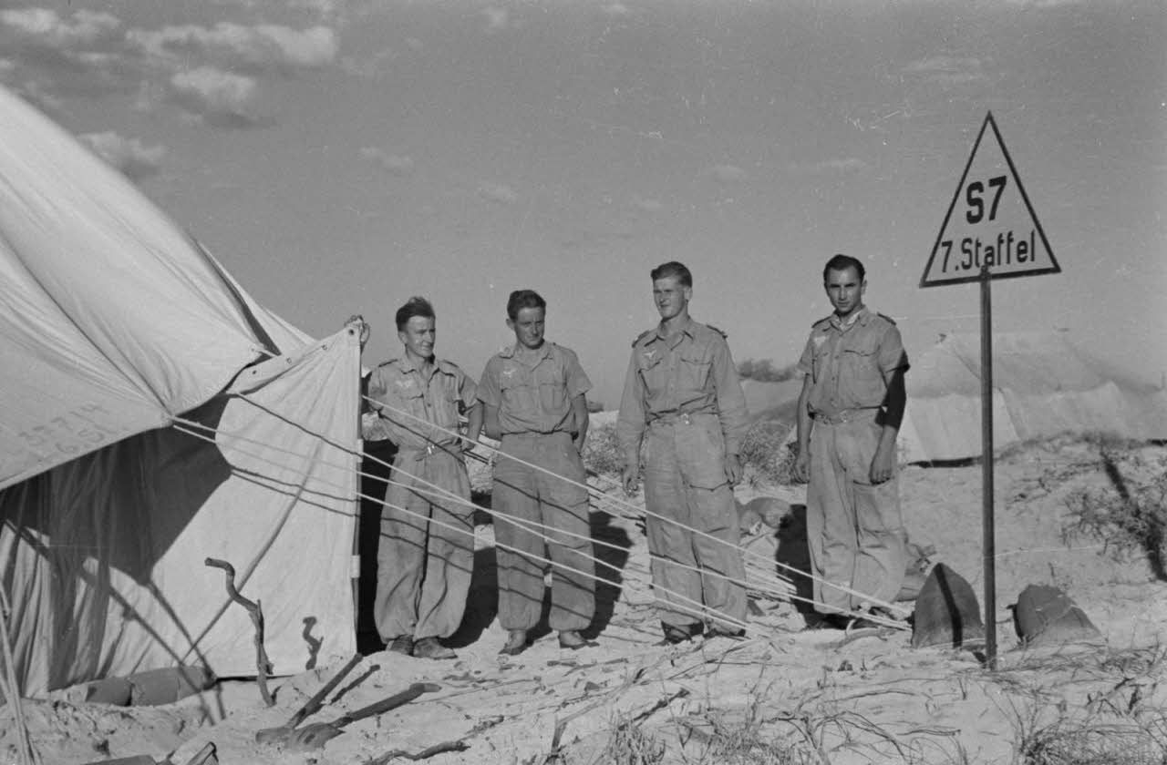 Depuis leur campement, les reporters photographient un bombardement allié à l'horizon. Portraits de membres de la Luftwaffe Kriegsberichter Kompanie 7. Gravure en forme du continent africain sur lequel on peut lire le nom du capitaine Hans-Joachim Marseille. Une croix de chevalier de la croix der fer (Ritterkreuz) ainsi que les feuilles de chêne (Eichenlaub) sont également reproduits. Portrait de l'adjudant-chef Hans Gross, reporter de la presse écrite et photographe au sein de la Luftwaffe Kriegsberichter Kompanie 7 (Lw.K.b.K). Hans Gross pose en tenant la dérive du chasseur Messerschmitt Bf-109 G-2 piloté par Hans-Joachim Marseille. On y reconnaît ses victoires aériennes et le chiffre "100" pour sa 100e victoire aérienne obtenue le 17 juin 1942 au sein du Jagdgeschwader 27.