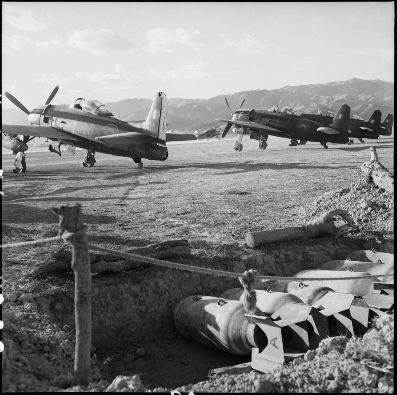 Des avions de chasse Bearcat et des bombes dans leurs alvéoles sur le terrain d'aviation de Diên Biên Phu.