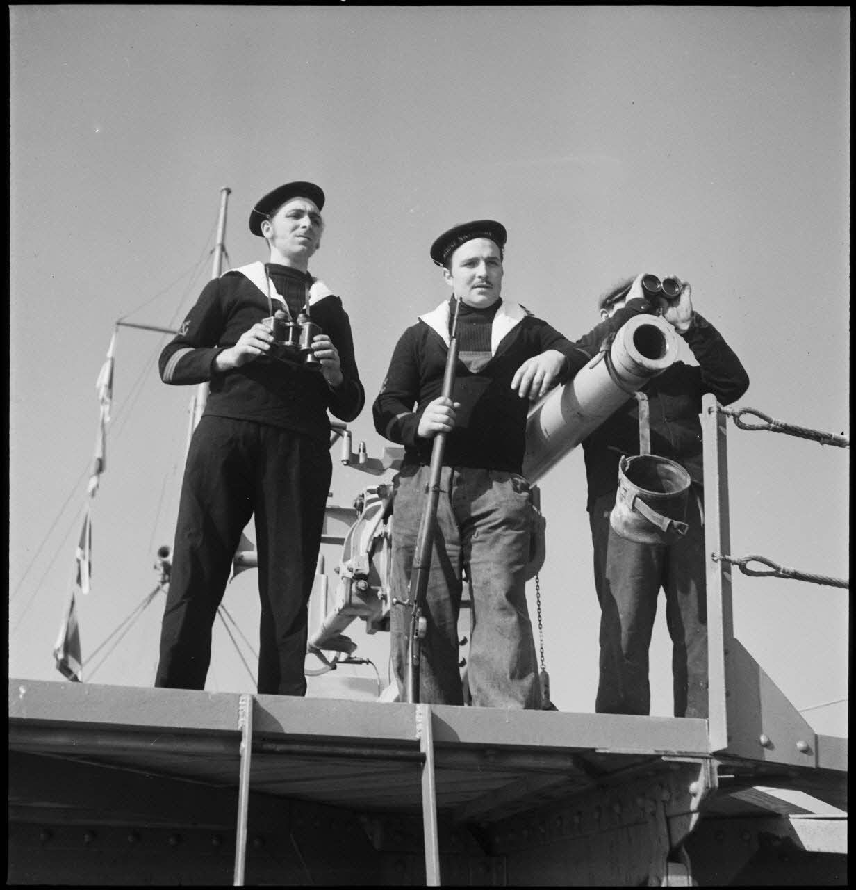 Des canonniers observent l'horizon depuis la plate-forme sur laquelle se trouve le canon de 90 mm du pétrolier Bourgogne.