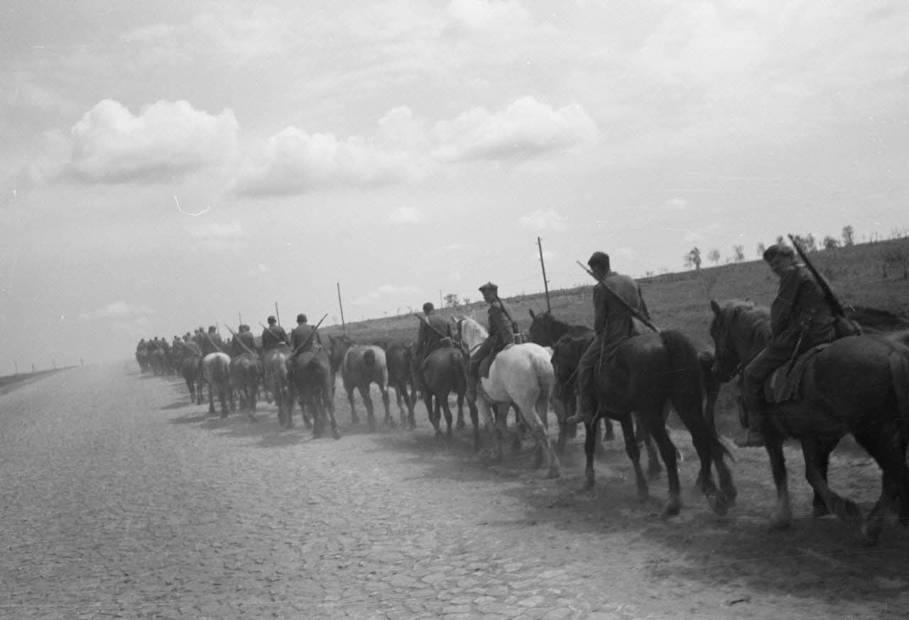 Campagne de vaccination, progression de cavaliers allemands sur une route importante (Rollbahn), un canon de 3,7 cm Flak.