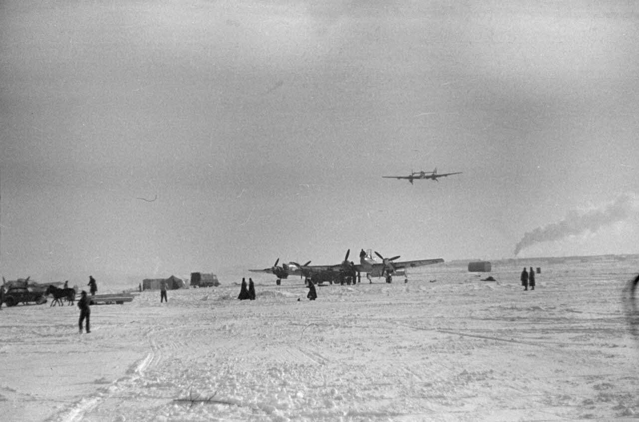 On reconnaît l'insigne du 1./StG.2 sur le nez de l'avion (DAA 2704 L14 et L15). A la descente de l'avion, l'équipage est porté par les pilotes et les mécaniciens du groupe de bombardement. Hans-Ulrich Rudel et Erwin Hentschel posent pour le reporter avec un cochon (porc) dans les bras, un signe de chance.