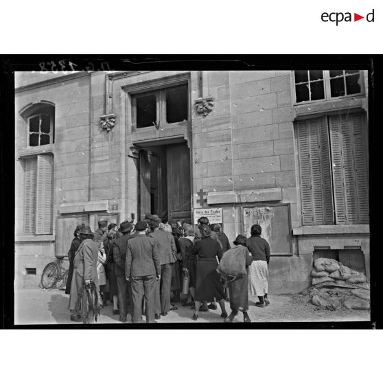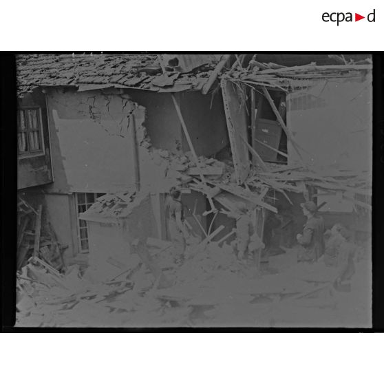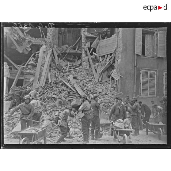 Des civils et des hommes de la défense passive évacuent les gravats d'une maison détruite par le bombardement allemand sur la ville de Nancy.