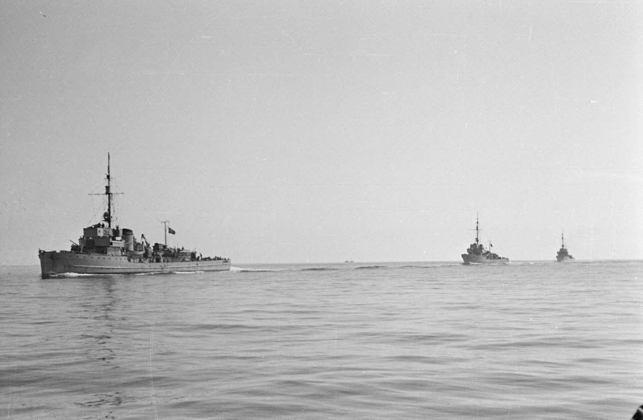 Des dragueurs de mines de la Kriegsmarine protègent le sous-marin U-552 lors de son retour vers le port de Saint-Nazaire.