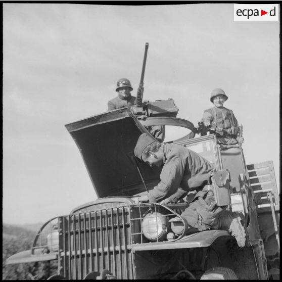 Le caporal d'un détachement du 146e régiment d'infanterie (RI) contrôle le moteur de leur véhicule dans le secteur de Tablat.