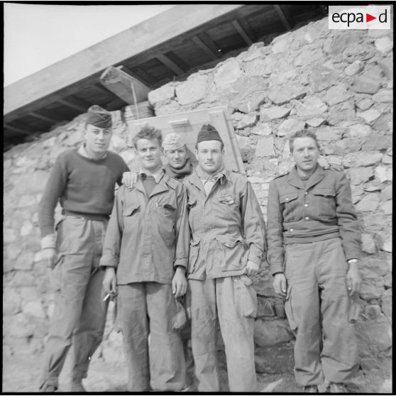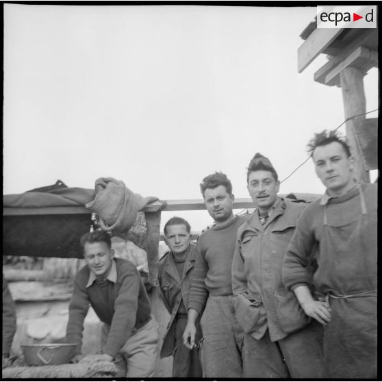 Portrait de groupe de soldats du 146e régiment d'infanterie (RI) lors de la préparation du repas à la base de Mihoub (sud de Tablat).