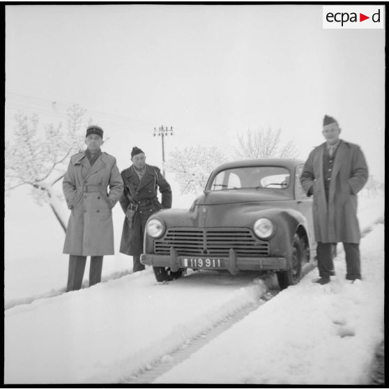 Le commandant Chambreuil du 146e RI et des officiers posent auprès d'une Peugeot 203 sur une route enneigée de Tablat.