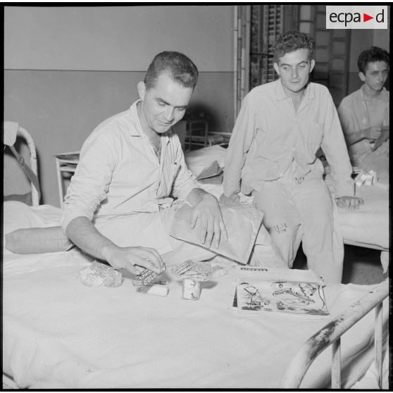 Un blessé de l'hôpital Maillot découvrant le contenu de son colis offert par des étudiantes.