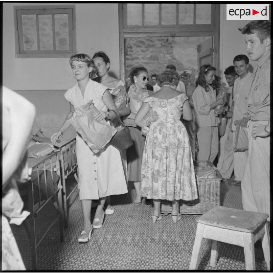 Des étudiantes d'Alger dans une chambrée à l'hôpital Maillot pour la distribution de colis aux blessés.