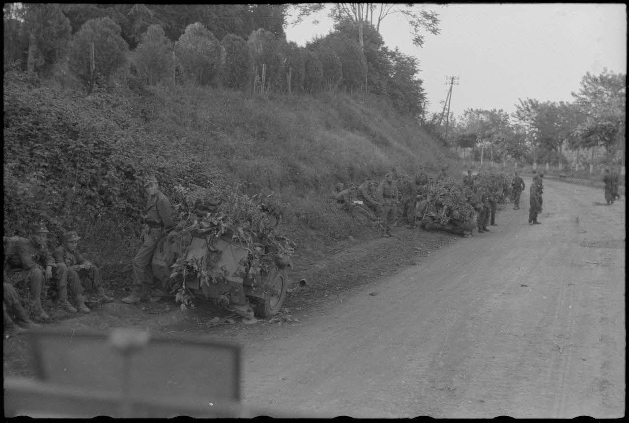 Des fantassins et des parachutistes allemands marquent une pause le long d’une route (FALLAOK F2089 L15 à L21). Des officiers de la Wehrmacht autour d’une carte (FALLAOK F2089 L22 à L24). Les fantassins dépendent de la 65e division d'infanterie. Des troupes aéroportées allemandes sur une route (FALLAOK F2089 L25 à L27). Un Panzer VI "Tigre" du Schwere Panzer Abteilung 508 est recouvert de branches d'arbres (FALLAOK F2089 L28 à L30).