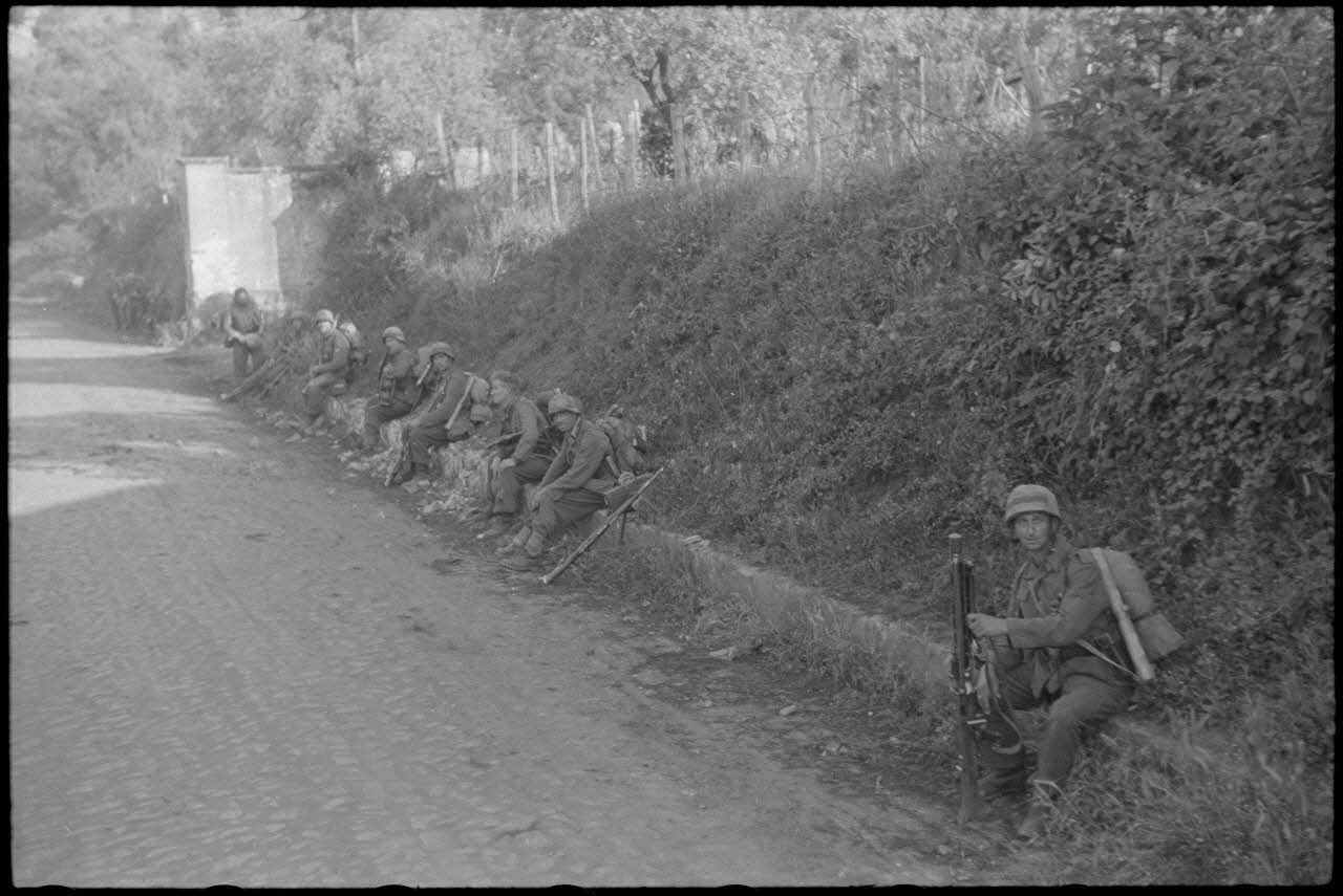 Des fantassins allemands marquent une pause sur une route au sud de Rome.