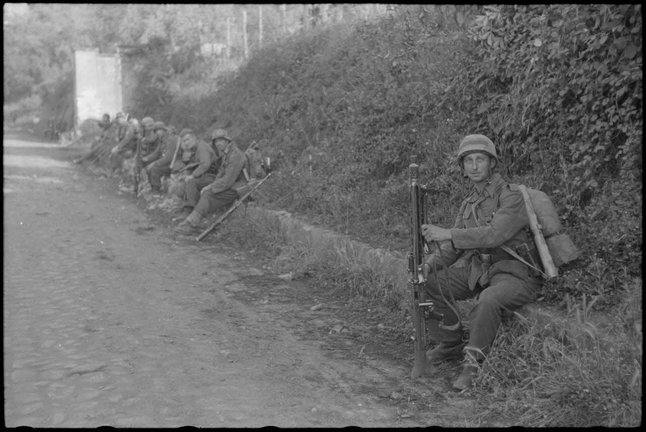 Des fantassins et des parachutistes allemands marquent une pause le long d’une route (FALLAOK F2089 L15 à L21). Des officiers de la Wehrmacht autour d’une carte (FALLAOK F2089 L22 à L24). Les fantassins dépendent de la 65e division d'infanterie. Des troupes aéroportées allemandes sur une route (FALLAOK F2089 L25 à L27). Un Panzer VI "Tigre" du Schwere Panzer Abteilung 508 est recouvert de branches d'arbres (FALLAOK F2089 L28 à L30).