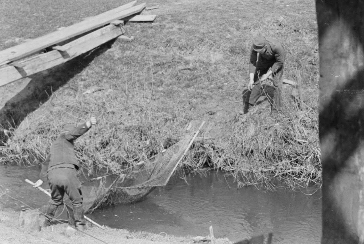 Des fantassins allemands pêchent à proximité de leurs positions défensives.