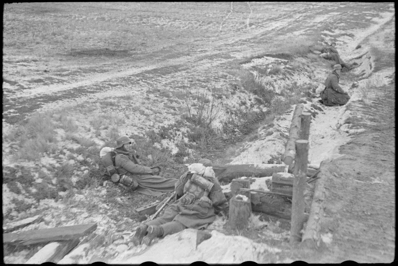 Note : consulter le reportage PK697 F966 qui présente des portraits de fantassins de la 4e division d'infanterie de l'armée de l'Air allemande (4.Luft-Feld-Division). Le cliché PK697 F966 L26 quant à lui nous précise la date du reportage grâce à une éphéméride sur laquelle on peut lire "Donnerstag 3 Februar" (jeudi 3 février 1944).