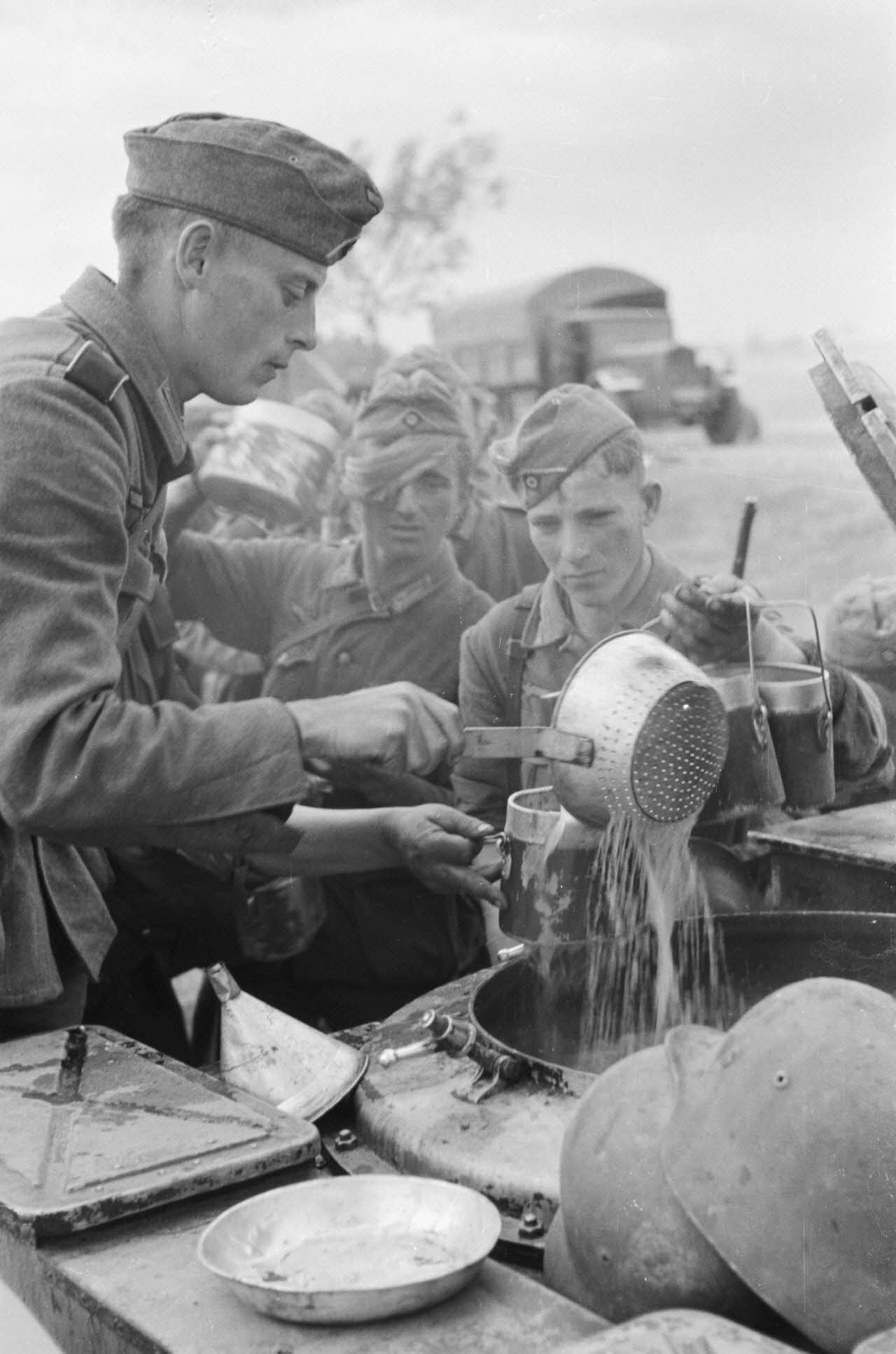 Des fantassins de la 137. infanterie division patientent devant une cuisine roulante.