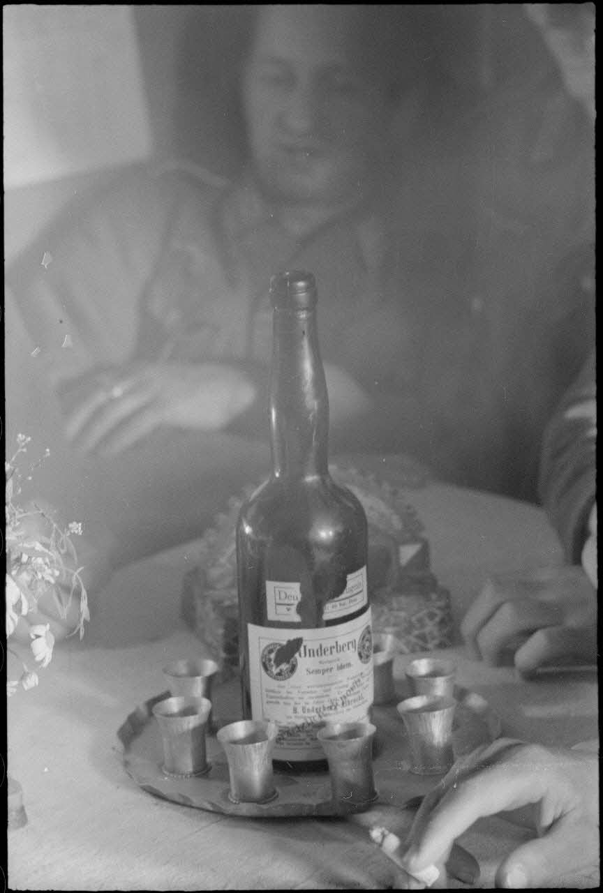 Des fantassins de la 205. Infanterie-Division autour d'une table vont partager une bouteille de Underberg (Semper idem) connue pour sa composition de plantes aromatiques.