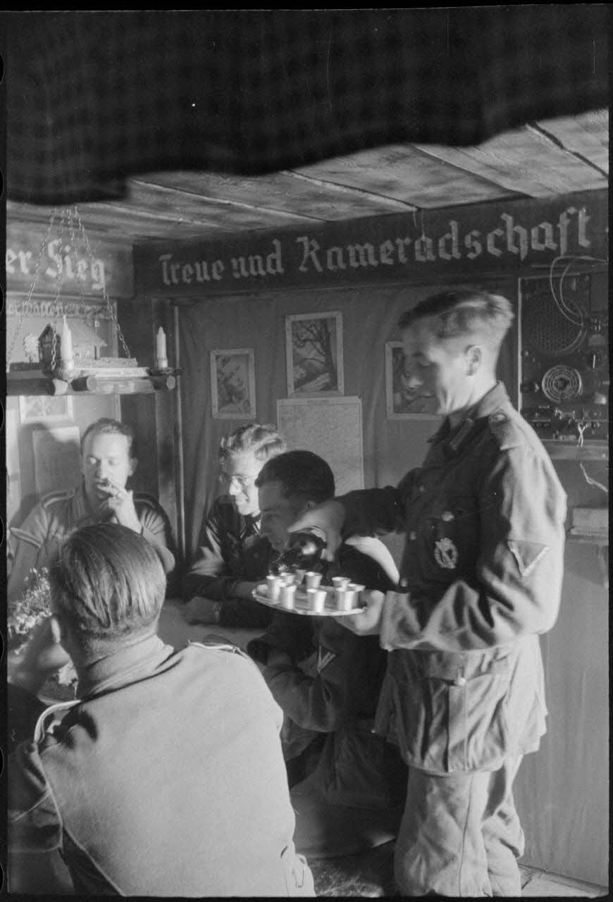 Un fantassin sculpte un bâton de marche (PK697 F772 L11 et L12). Des fantassins autour d'une table vont partager un verre d'une bouteille de Underberg (Semper idem) aux plantes aromatiques ( PK697 F772 L13 à L15). Aspects des lits réservés aux soldats, un poêle à bois les préserve du froid. Le sommier est rudimentaire et le plafond loge les fusils Mauser 98 k et les casques. Chaque recoin est utilisé pour ranger des objets, ici le plancher reçoit également des provisions aromatiques (PK697 F772 L23 à L24). Au mur, des étagères accueillent des livres et de la vaisselle. Plus loin, une pièce est réservée à un officier ( PK697 F772 L26 à L27). L'entrée de l'abri baptisé "Bunker der schweren Jungs" (abri des jeunes costauds) ( PK697 F772 L28). Un râtelier accueille l'équipement individuel des fantassins, composé de fusils Mauser 98k, de casques et de masques à gaz ( PK697 F772 L29). Au mur, une étagère accueille le courrier et de la lecture, ici le magazine "Die Woche" ( PK697 F772 L30). Un portrait d'Adolf Hitler et une horloge (coucou) se partagent le reste du mur ( PK697 F772 L31 et L32).