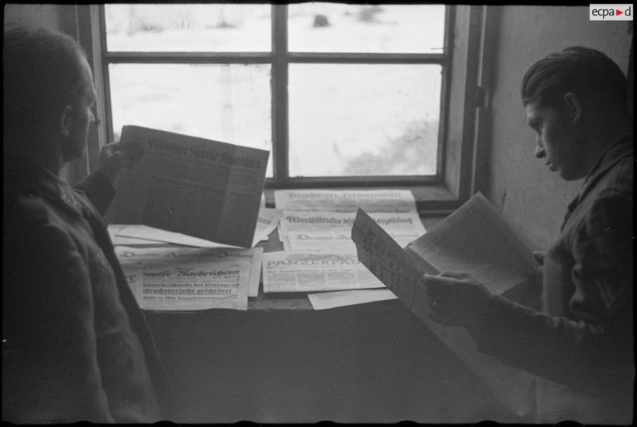 Des fantassins de la Luftwaffe consultent les titres de la presse allemande.