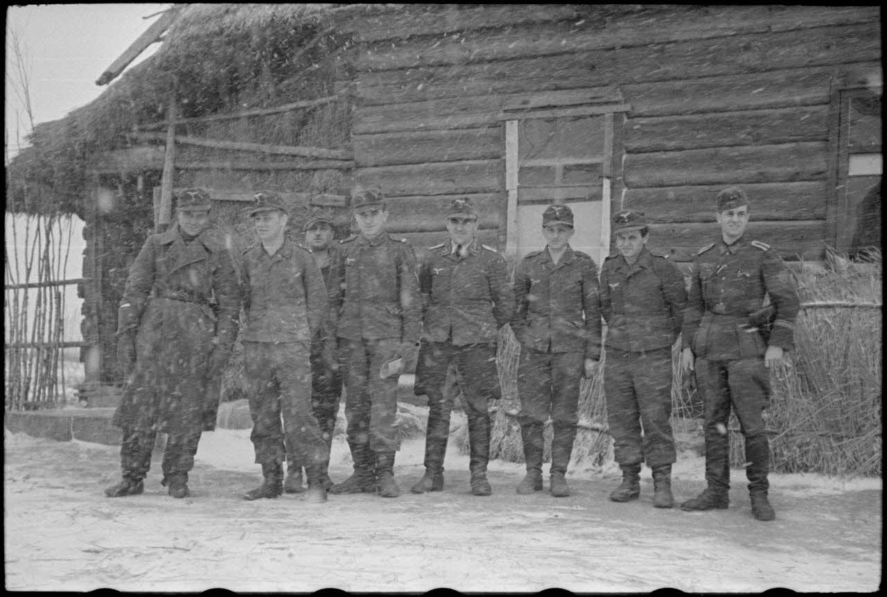 Note : consulter le reportage PK697 F966 qui présente des portraits de fantassins de la 4e division d'infanterie de l'armée de l'Air allemande (4.Luft-Feld-Division). Le cliché PK697 F966 L26 quant à lui nous précise la date du reportage grâce à une éphéméride sur laquelle on peut lire "Donnerstag 3 Februar" (jeudi 3 février 1944).