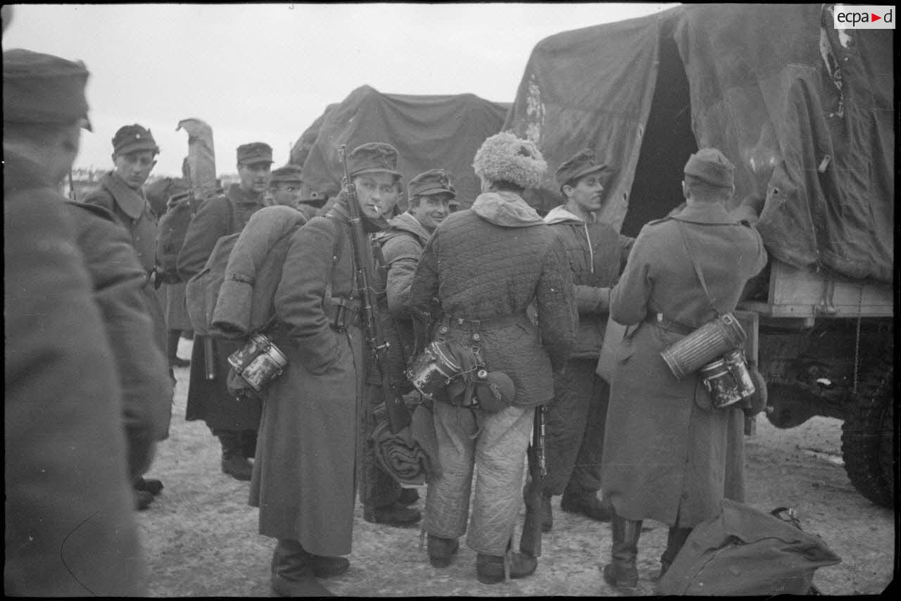 Des fantassins ou Panzergrenadiers vont monter à bord d'un camion.