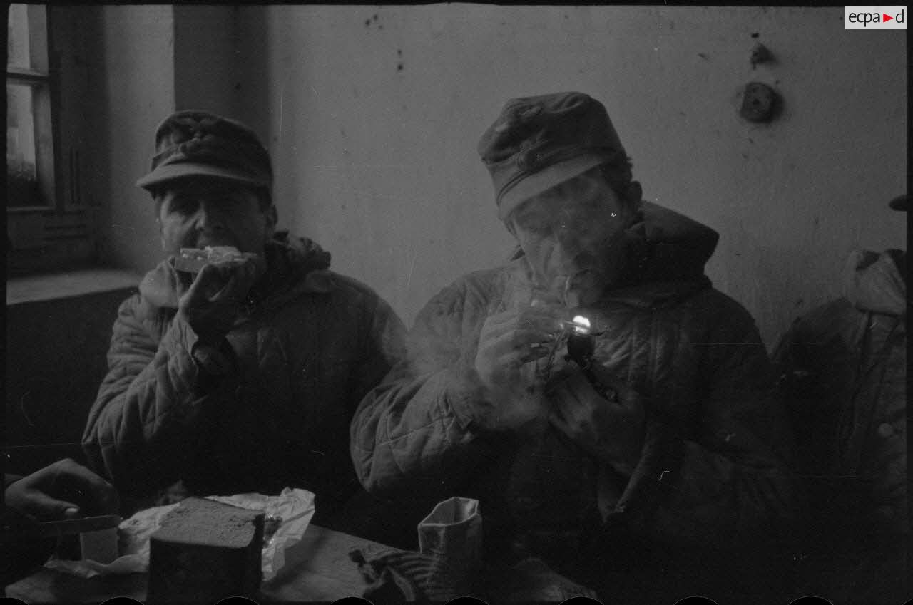 Des fantassins terminent un repas à l'abri d'une maison.
